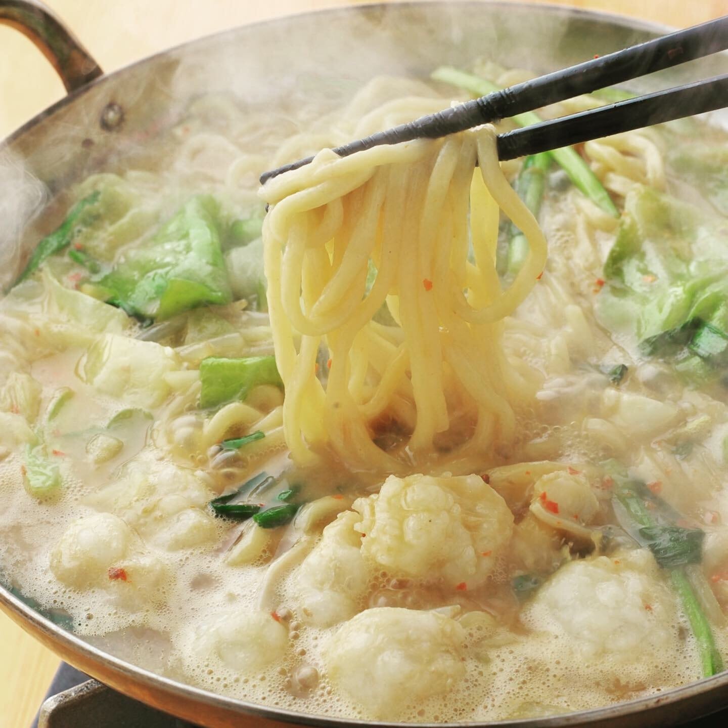 滋賀県の土地柄を活かし、ブランド牛である近江牛の新鮮な生もつを使用。スープはとんこつと和風出汁のWスープで、旨味と甘味が感じられる。麺は特注の極太麺。煮込んでいっても伸びにくいのが特徴。もちもち感がずっと残るように仕上げました。ここに大量の野菜と一緒に煮込み、召し上がってください。